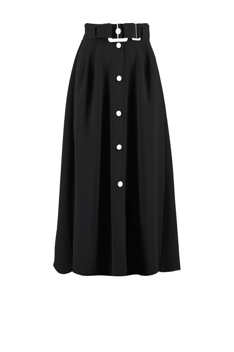 The Telluride Skirt features a high rise waist, front button placket, contrast covered buttons and a contrast buckle waist belt. The skirt has pleats at the waist and a flared silhouette.