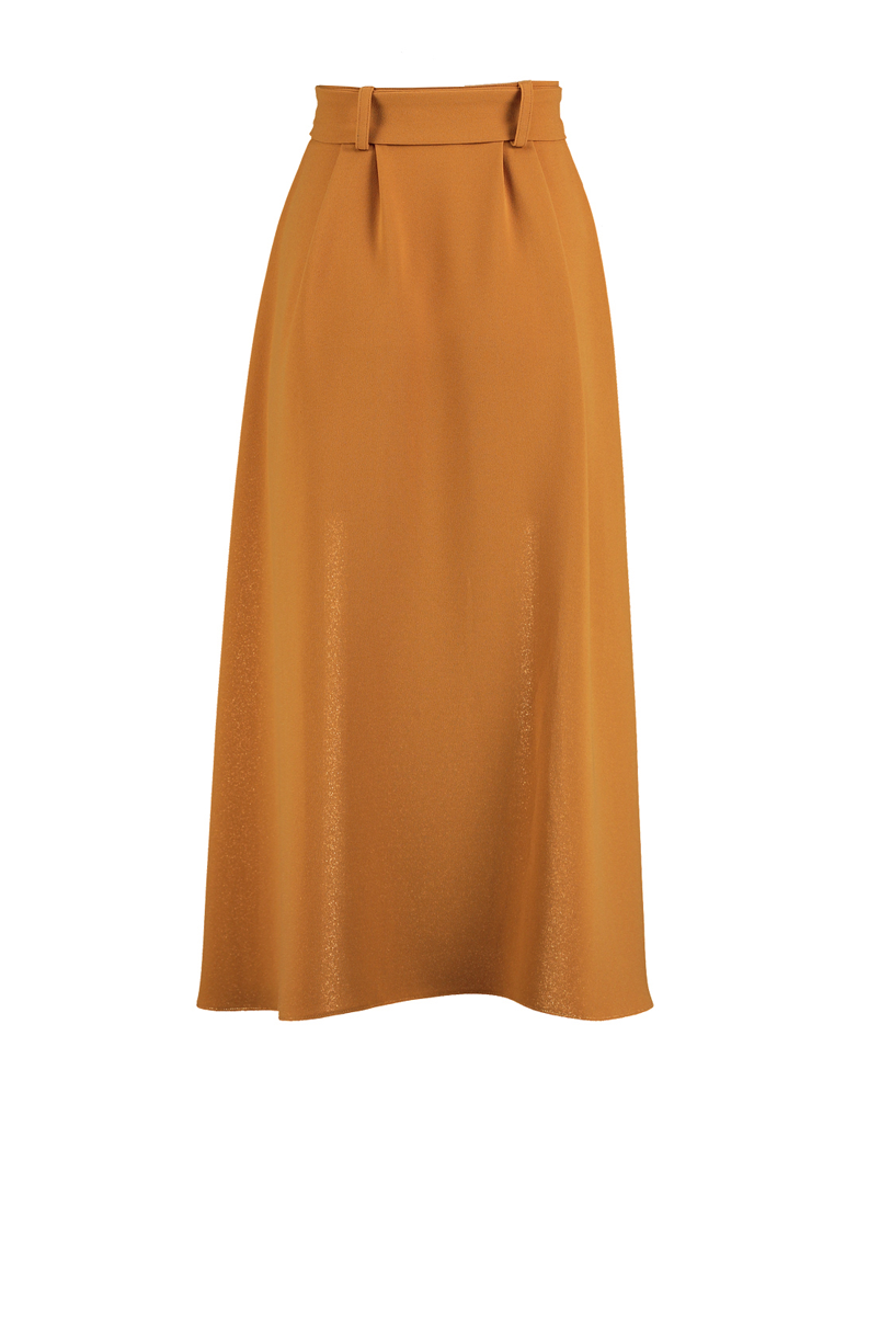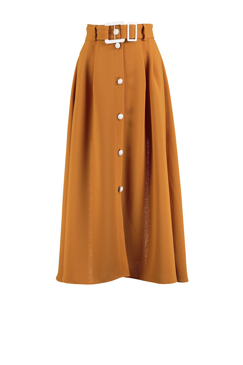 The Telluride Skirt features a high rise waist, front button placket, contrast covered buttons and a contrast buckle waist belt. The skirt has pleats at the waist and a flared silhouette.