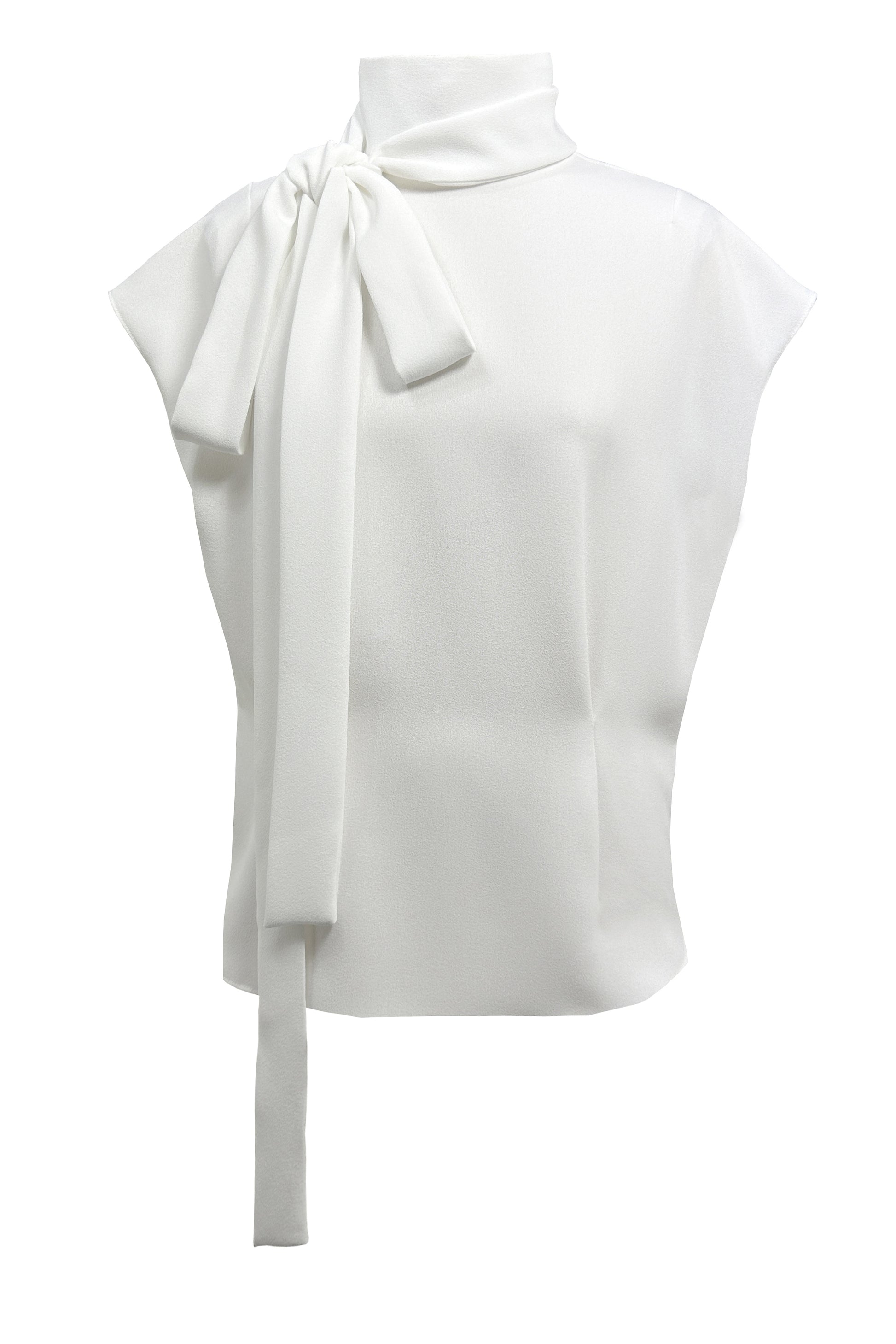 The Tie Neck Blouse has a slightly oversized fit and features a tailored turtleneck and a long scarf at the neck that can be tied into a graceful bow. The blouse has delicate dart details at the shoulder and waistline and armholes that drape into a slightly capped sleeve.