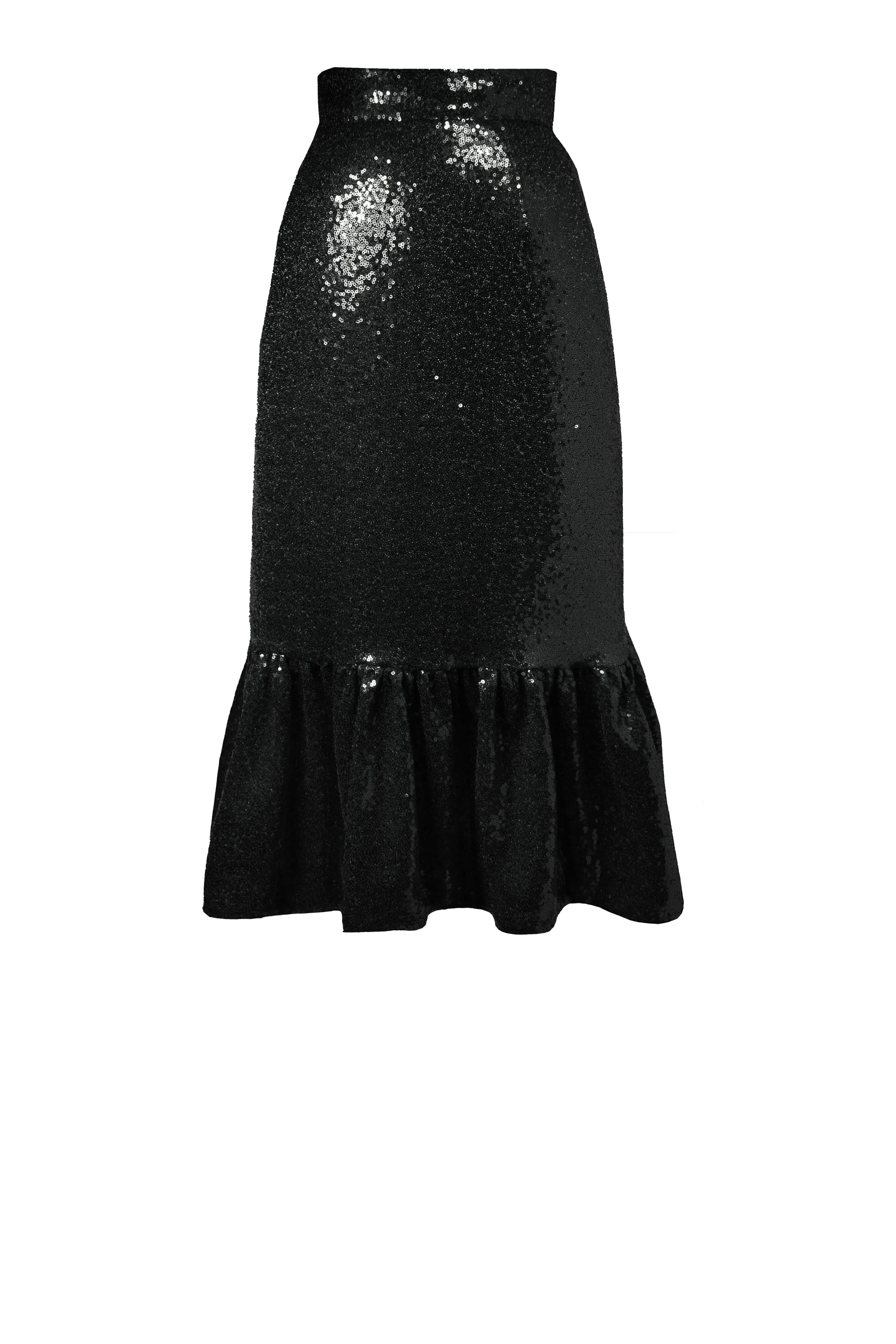 The Yomi Ruffle Skirt features a fitted waistband, and a pencil fit with a generous ruffled hem.